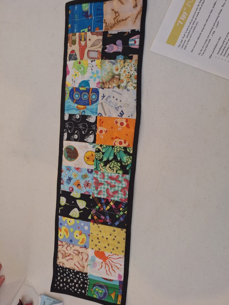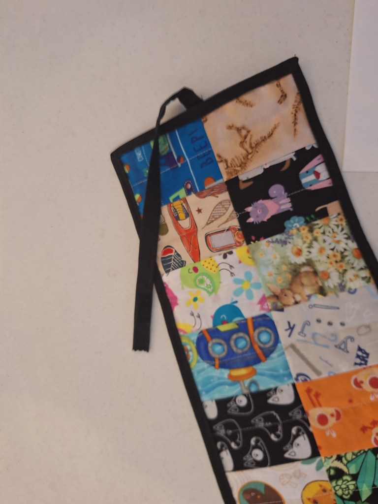 Created using 11 rows on each side (double sided) of 3″ x 4″ novelty fabric squares. Linda used polyester batting to withstand multiple washings and it wouldn’t shift as much. She put a running quilt stitch through the center of each square.